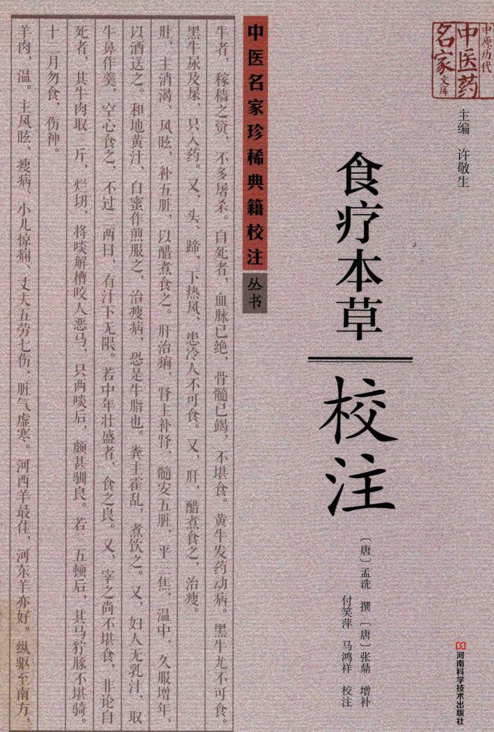 《食疗本草》为唐代孟诜所撰。原书早佚,仅有残卷及佚文散见于《医心方》、《证类本草》等书中。据史书记载,孟诜所撰《补养方》,唐开元年间经张鼎增补八十九条,共有二百二十七条,皆论食药治病之道,故改称为《食疗本草》,是我国食疗史上最早以食疗命名的《食疗本草》专著。此次校注的《食疗本草》,是根据《医心方》、《证类本草》等书中所存佚文及敦煌石窟残卷本汇集而来,共辑注二百六十九条及附录八条。